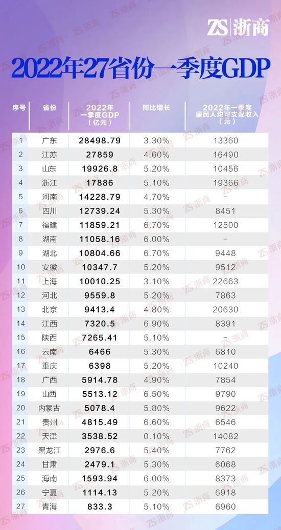随着江苏、浙江、甘肃今天公布了一季度经济运行情况,已有27个省份公布了今年一季度经济数据。