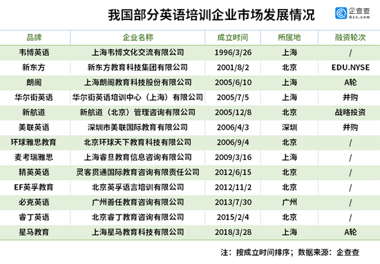 在激烈的竞争环境下,创建英语培训行业的品牌效应至关重要。在这场大浪淘沙中,最终只有真正有实力的英语培训机构可以脱颖而出。从部分英语培训机构品牌的市场发展情况来看,企查查数据显示成立时间较早的品牌有韦博英语、新东方、朗阁、华尔街英语、新航道等。从市场融资情况来看,新东方成立于2001年,于2006年赴美上市融资1亿美元;上海的朗阁教育于2016年获得挚信资本的A轮融资;星马教育于2018年获得三立国际教育集团的A轮融资;新航道于2016年获得IDG资本的战略投资。