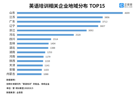 从各省份数量分布来看,企查查数据显示,截止目前英语培训相关企业数最多的省份是山东省,共4699家。排名第二的是江苏省,共3806家,广东省以3712家企业数量排名第三。