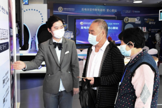 中国电信营业厅爱心翼站正在对老年人进行反诈宣传