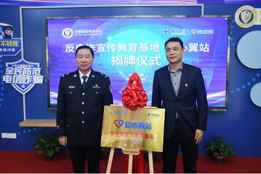 安徽省打击治理电信网络新型违法犯罪工作联席会议办公室主任、安徽省公安厅刑警总队总队长郑根贤,中国电信安徽公司党委委员、副总经理张军共同为“反电诈宣传教育基地”揭牌