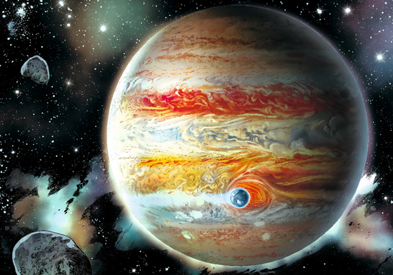 《流浪地球》里的木星,沸腾的暗红色的云海上空,地球仿佛是一只蓝色小弹珠。