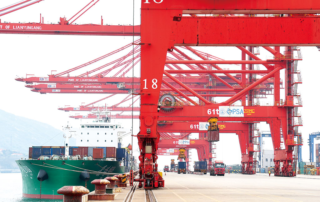 图为当日,江苏连云港(4.630, -0.11, -2.32%)港集装箱码头,一派繁忙景象。 耿玉和 摄
