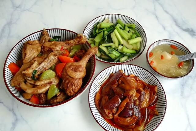 第二天:胡萝卜莴笋焖鸭+炒红菜苔+红油茄子+雪梨银耳羹现在很少吃猪肉,都是买鸡鸭鱼比较多,鸭肉加胡萝卜和莴笋一起焖,好看又好吃。茄子先用盐腌一下,再下锅炒,茄子不吸油,熟得快;最后再加点辣椒酱一起炒,比肉都好吃。红菜苔刚上市,买一把尝尝鲜,有点小贵。秋季比较干燥,要多喝点银耳羹,回到家就把银耳泡好洗干净,丢到砂锅里炖,出胶后,再加入枸杞和雪梨继续炖一会,最后加点冰糖调味就可以了,一人一碗,润肺又养颜。这一餐成本约40元,花的时间也比较长,不过家人吃得很开心,值了!
