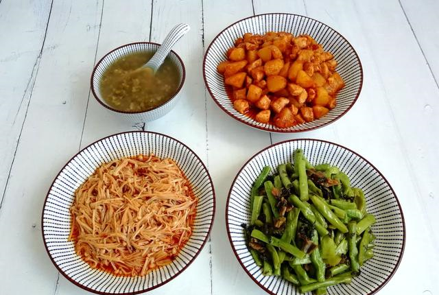 第四天:绿豆汤+土豆炒鸡丁+拌金针菇+梅干菜炒豆角绿豆汤是提前预约好的,到家就可以喝了,这天气太干燥了,又吃了月饼,喝碗绿豆汤去去火气。土豆炒鸡丁,我们家每周至少做一次,营养又好吃,喜欢的朋友们可以在家试试,特别简单。鸡胸肉洗净切好后,加点盐、料酒、蚝油、胡椒粉、生粉、花生油抓匀,腌制一会,腌制过的鸡胸肉更鲜嫩,一盘都不够吃。土豆切好,提前煮熟,起油锅,先放入葱姜蒜煸香,再放入鸡胸肉炒至变色,放入土豆混合炒匀,加入适量生抽和辣椒酱炒匀即可。梅干菜和豆角是绝配,我经常这样炒,特别开胃。这一餐比较简单,也是半小时上桌,成本约12元。