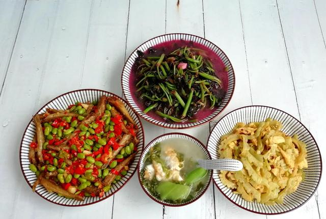 第三天:毛豆炒小河鱼+蒜蓉苋菜+苦瓜炒蛋+荷包蛋丝瓜紫菜汤小河鱼是提前炸好的,毛豆煮熟后,再放小河鱼一起炒就可以了,特别好吃。我家孩子喜欢用苋菜汁拌饭吃,苋菜很嫩,加点蒜蓉一起炒,很美味。最近有点上火,特意去买了苦瓜炒鸡蛋,又做了丝瓜汤,都是去火的。这一餐花的时间不多,半小时就上桌了,成本约20元。