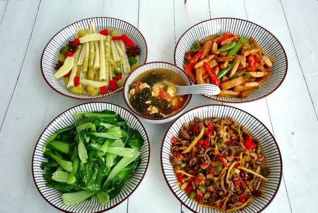 今年两个孩子都在学校吃午餐,老公中午也在食堂解决,我在附近找了一份工作,下午就可以下班了,工资不高,但是不耽误接送孩子,挺满足的。下午回到家后,孩子做作业,我做饭,一般六点左右吃晚餐。白天我们都各忙各的,只有晚餐才聚在一起吃饭,因此每天的晚餐,我都会用心准备,一般都是三菜一汤,每天吃光不浪费,发到朋友圈,一下子就火了,好多朋友点赞、留言。有的朋友说:每天有荤有素有汤,很健康;有的朋友说:不剩菜不浪费,拒绝精致穷;还有的朋友说:一看就是江西菜,顿顿都有辣椒。晒晒我们家的晚餐,感兴趣的朋友们一起看看吧!第一天:泡椒小竹笋+辣椒炒香干+炒小白菜+酸辣鸡胗+紫菜番茄蛋汤好久没吃小竹笋了,从冰箱里夹了一点出来,当零食吃,特别开胃。我和孩子都爱吃香干,加辣椒一起炒,简单又下饭。我们家江西汉子爱吃辣,酸辣鸡胗里面加了泡椒,特别符合他的胃口。青菜和汤是每天都少不了的。这一餐就鸡胗贵了点,四菜一汤加起来,成本约20元,开胃又营养,很实惠!