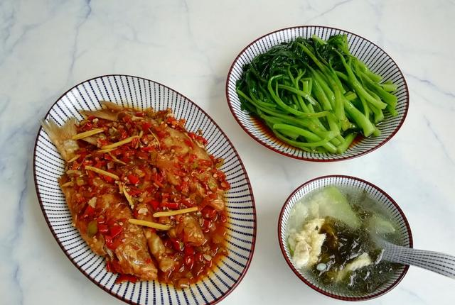 第五天:香辣河鱼+白灼菜心+丝瓜紫菜蛋花汤我们家很喜欢吃鱼,鱼肉处理干净后,均匀地裹上一层薄薄的面粉,再放入热油锅里煎,不容易粘锅,口感也更好,加点辣椒和调料焖煮入味就可以了,简单又好吃。现在菜心特别嫩,一把才两块钱,煮熟后,浇上调料就可以了,超简单的。饭前一碗汤,胜过良药方;丝瓜汤几分钟就能煮好,一人一碗,舒服!这一餐也是半小时上桌,成本约10元。