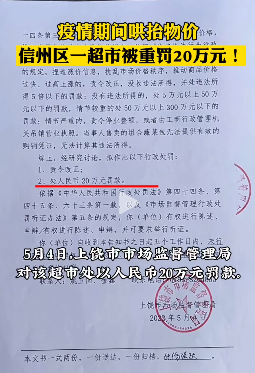 5月4日下午,上饶市市场监督管理局下达《行政处罚听证告知书》,责令当事人改正相关违法行为,并处人民币20万元罚款。
