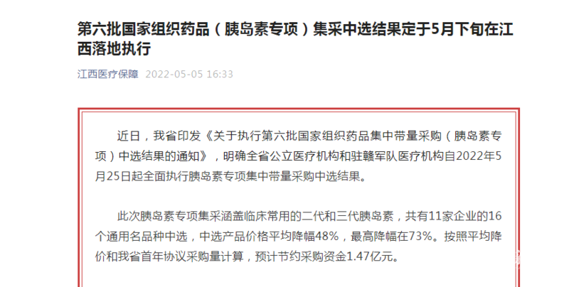 5月5日,江西省医疗保障局消息,近日,我省印发《关于执行第六批国家组织药品集中带量采购(胰岛素专项)中选结果的通知》,明确全省公立医疗机构和驻赣军队医疗机构,自2022年5月25日起全面执行胰岛素专项集中带量采购中选结果。