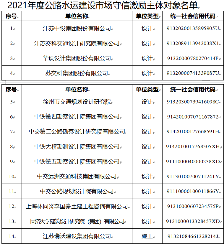 交汇点讯 5月12日,新华日报·交汇点记者获悉,江苏省交通运输厅公布2021年度公路水运建设市场守信激励主体对象名单(“红名单”),共有91家单位上榜,较上年度增加了47家。此次发布的“红名单”,是省交通运输厅根据《江苏省交通运输守信联合激励和失信联合惩戒对象名单管理办法》《江苏省公路水运建设市场信用信息管理办法》,结合全国交通运输信用信息共享平台和省公共信用信息系统失信行为查询情况后予以认定。