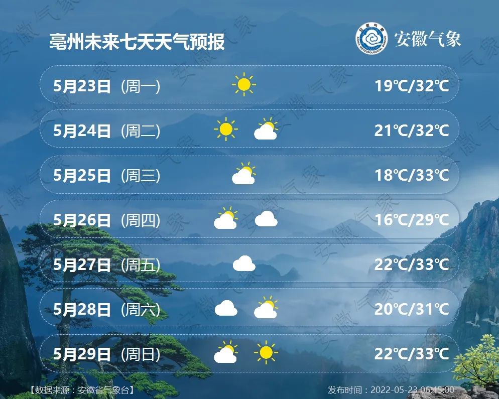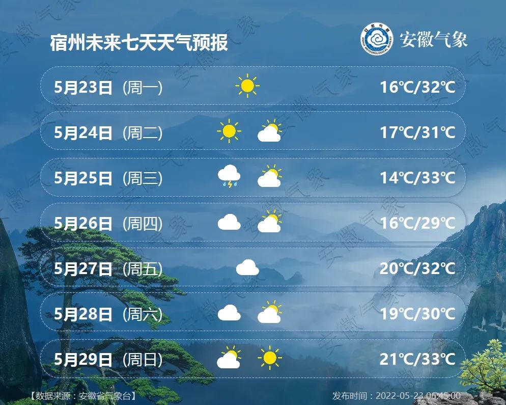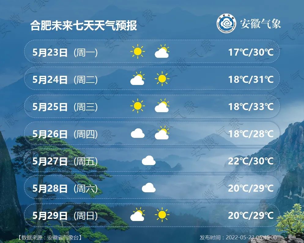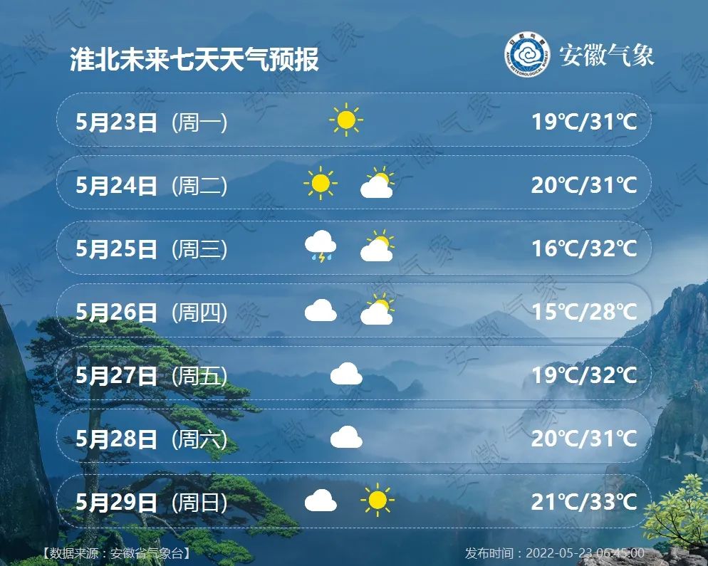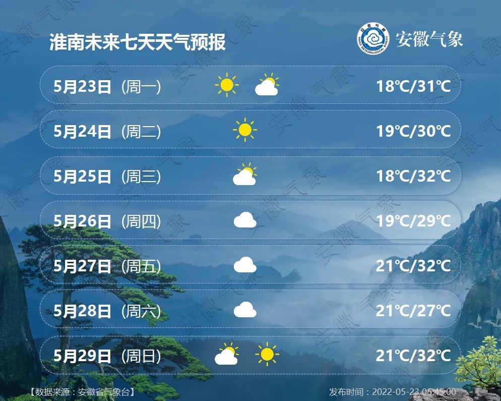 预计23日至27日江北地区以多云到晴天气为主,最高气温普遍超过30℃,仅25日部分地区有短时雷阵雨,并可能伴有雷暴大风等强对流天气;江南多阴雨天气。28日至29日淮河以南有一次降水过程,其中大别山区和沿江江南部分地区中到大雨。30日至31日江北晴天到多云,部分地区最高气温可达35℃以上。6月1日全省有阵雨或雷雨。