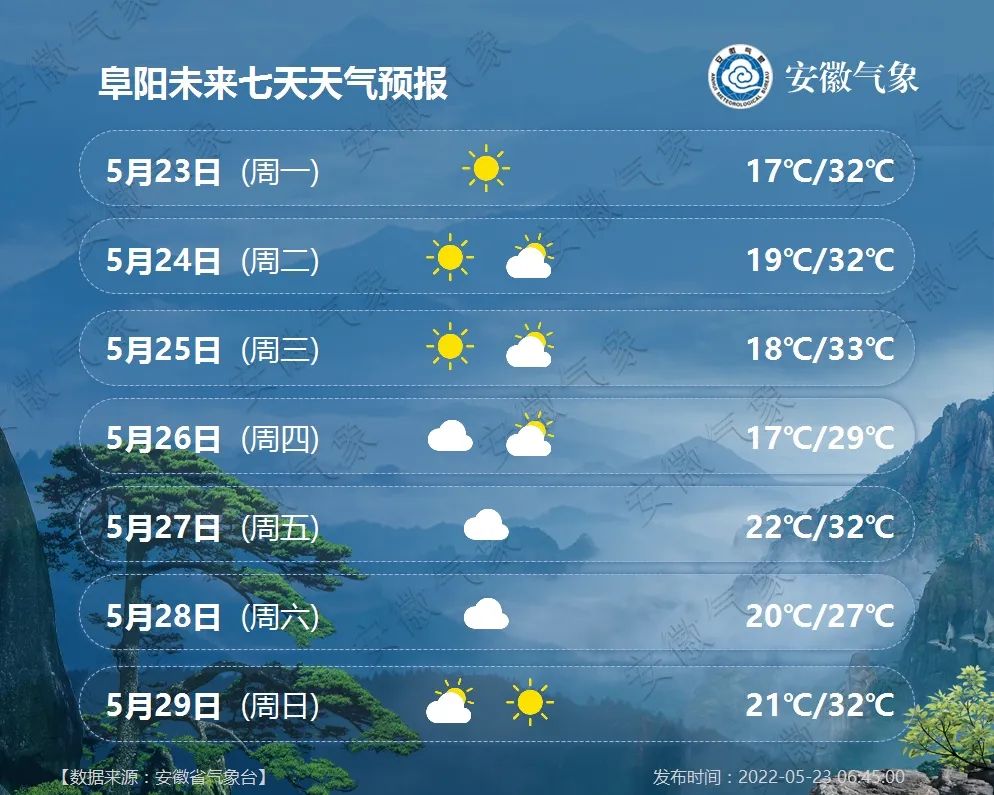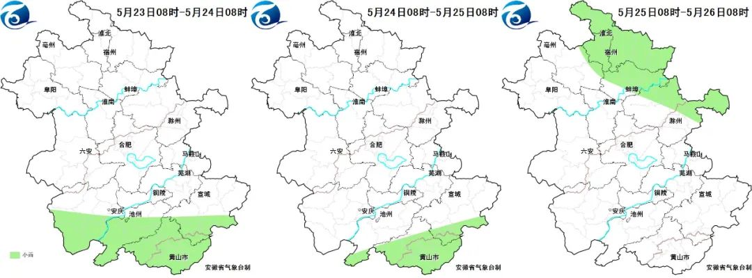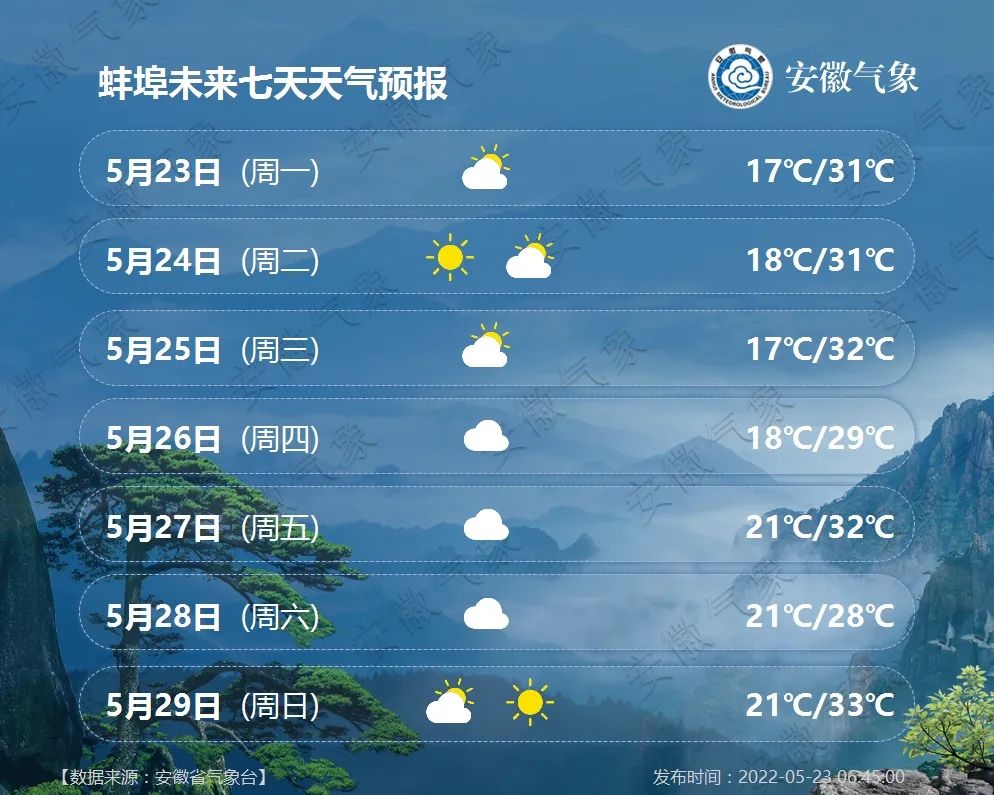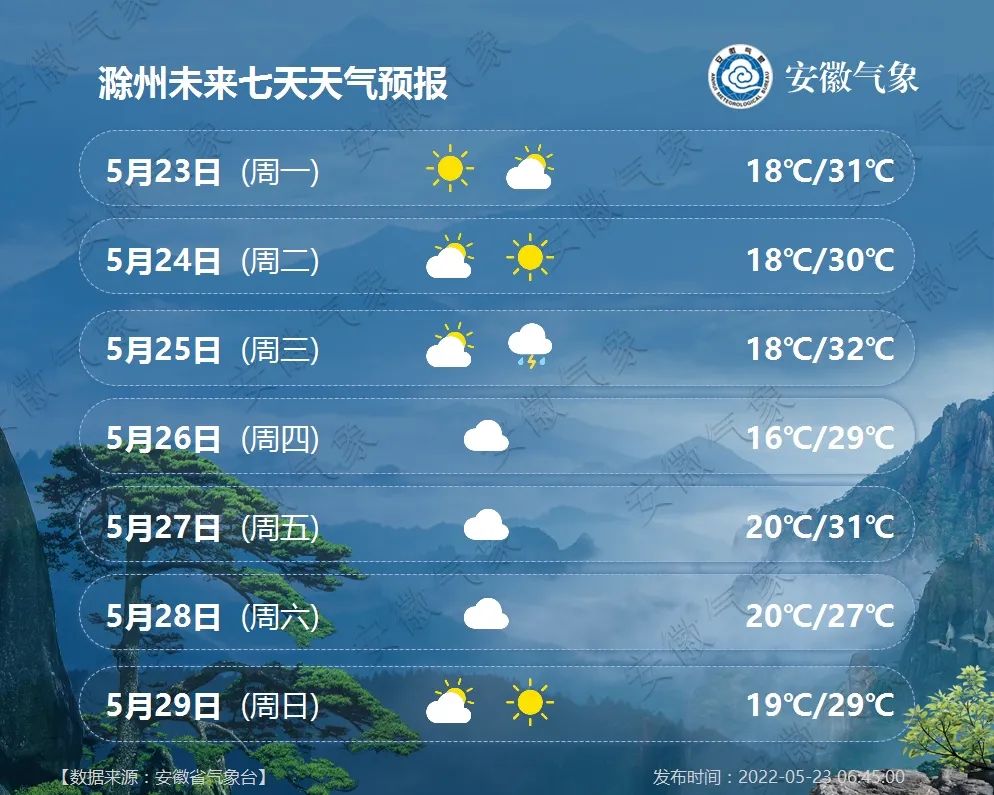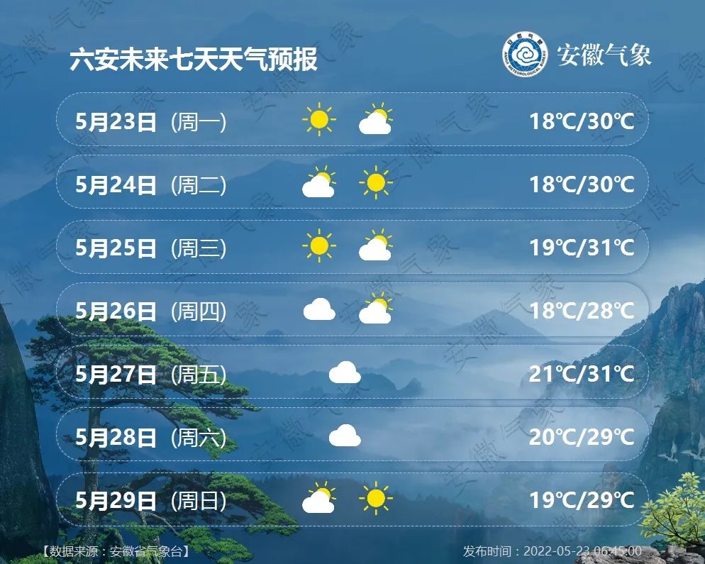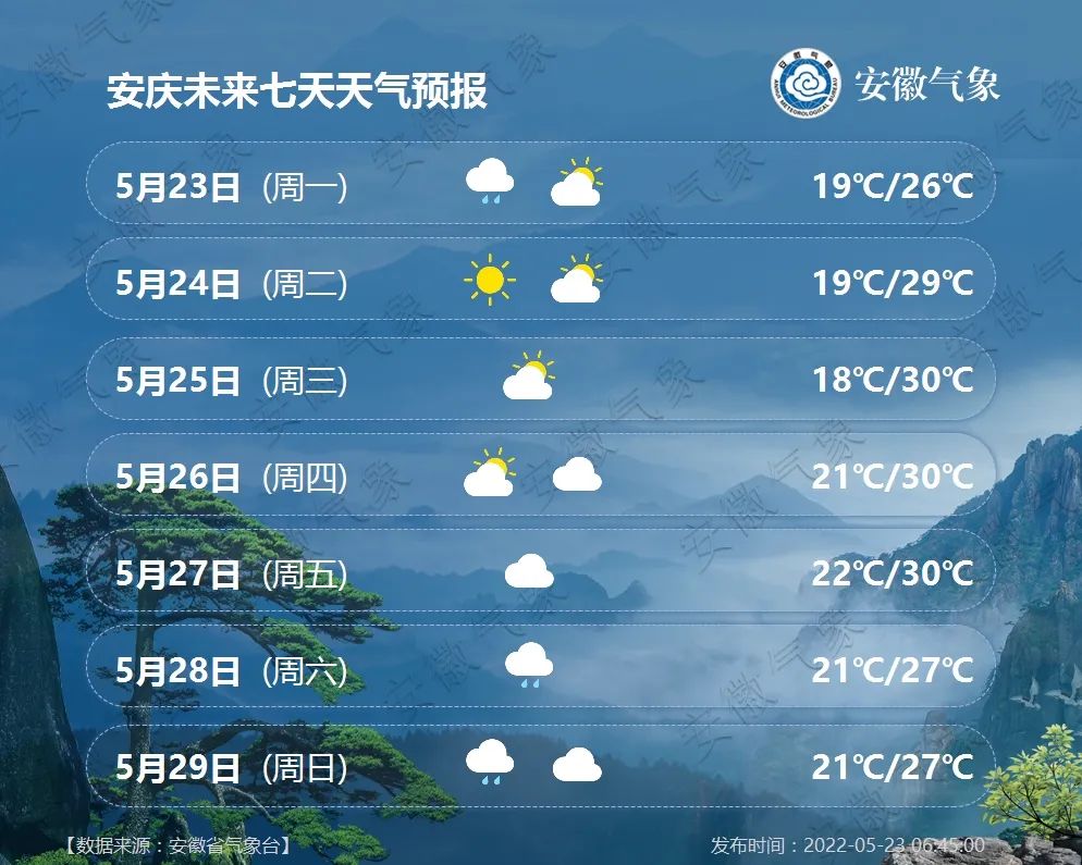 预计23日至27日江北地区以多云到晴天气为主,最高气温普遍超过30℃,仅25日部分地区有短时雷阵雨,并可能伴有雷暴大风等强对流天气;江南多阴雨天气。28日至29日淮河以南有一次降水过程,其中大别山区和沿江江南部分地区中到大雨。30日至31日江北晴天到多云,部分地区最高气温可达35℃以上。6月1日全省有阵雨或雷雨。