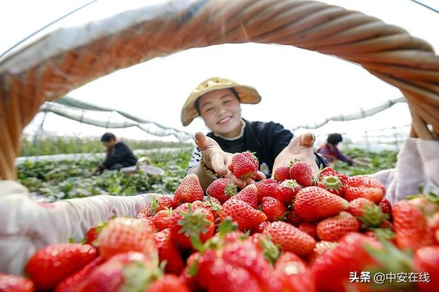 近日,阜阳市临泉县杨桥镇新安家庭农场的种植户在大棚内采收成熟的草莓。近年来,该县大力推进农旅融合发展,带动农民增收。 特约摄影 王彪 通讯员 陈远飞 摄