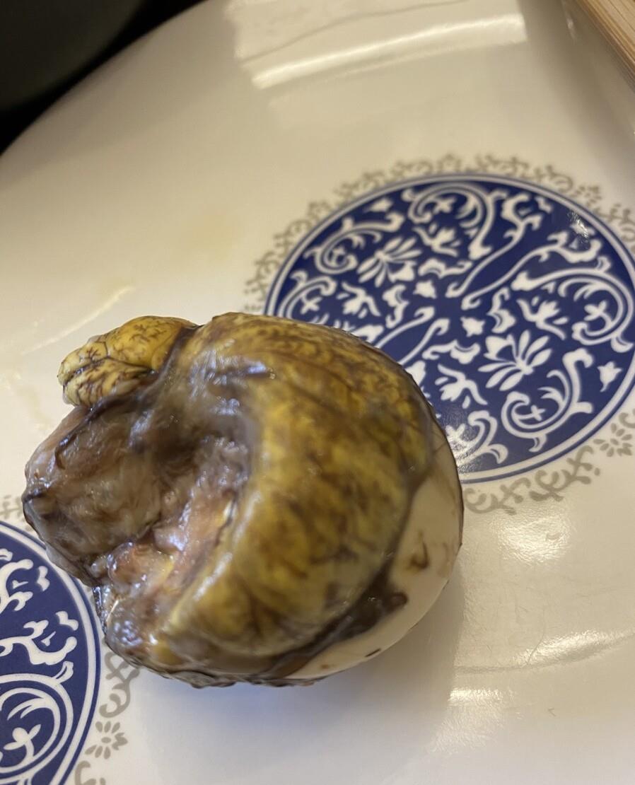 活珠子、旺鸡蛋。第一次在南京见到,朋友们都被吓一跳,但尝了一下,模仿着当地人的动作,在蛋壳上敲一个小洞,吮一口汁水,剥开蛋壳,蘸上椒盐,原来蛋香+肉香就是这吓人活珠子的味道。