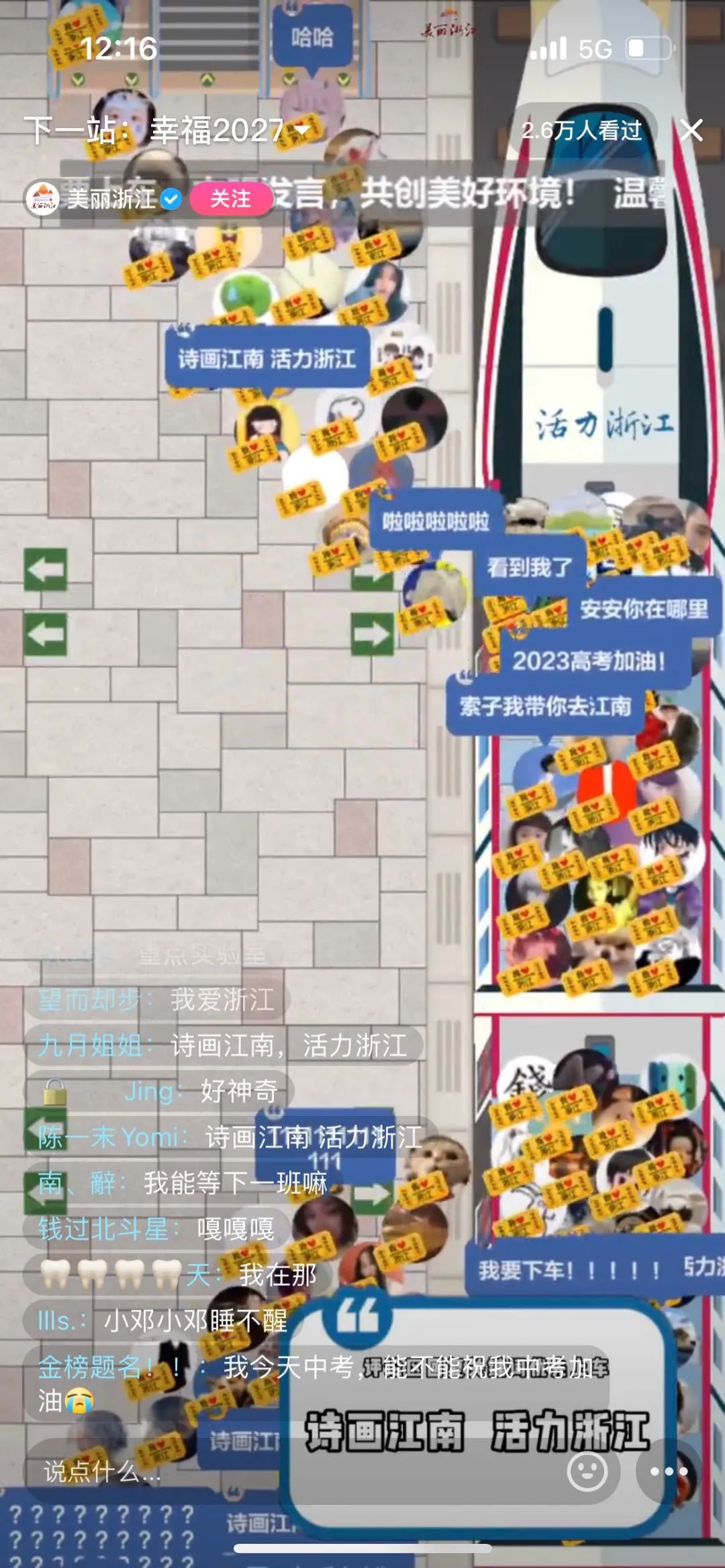 拿最近省域主题词“诗画江南 活力浙江”传播来说,“美丽浙江”策划了一个“开往幸福2027”的融媒互动直播。观众们带着“我爱浙江”的车票进站,在站台留下自己想说的话和美好祝愿,坐上名为“诗画江南”号、“活力浙江”号的列车出发。