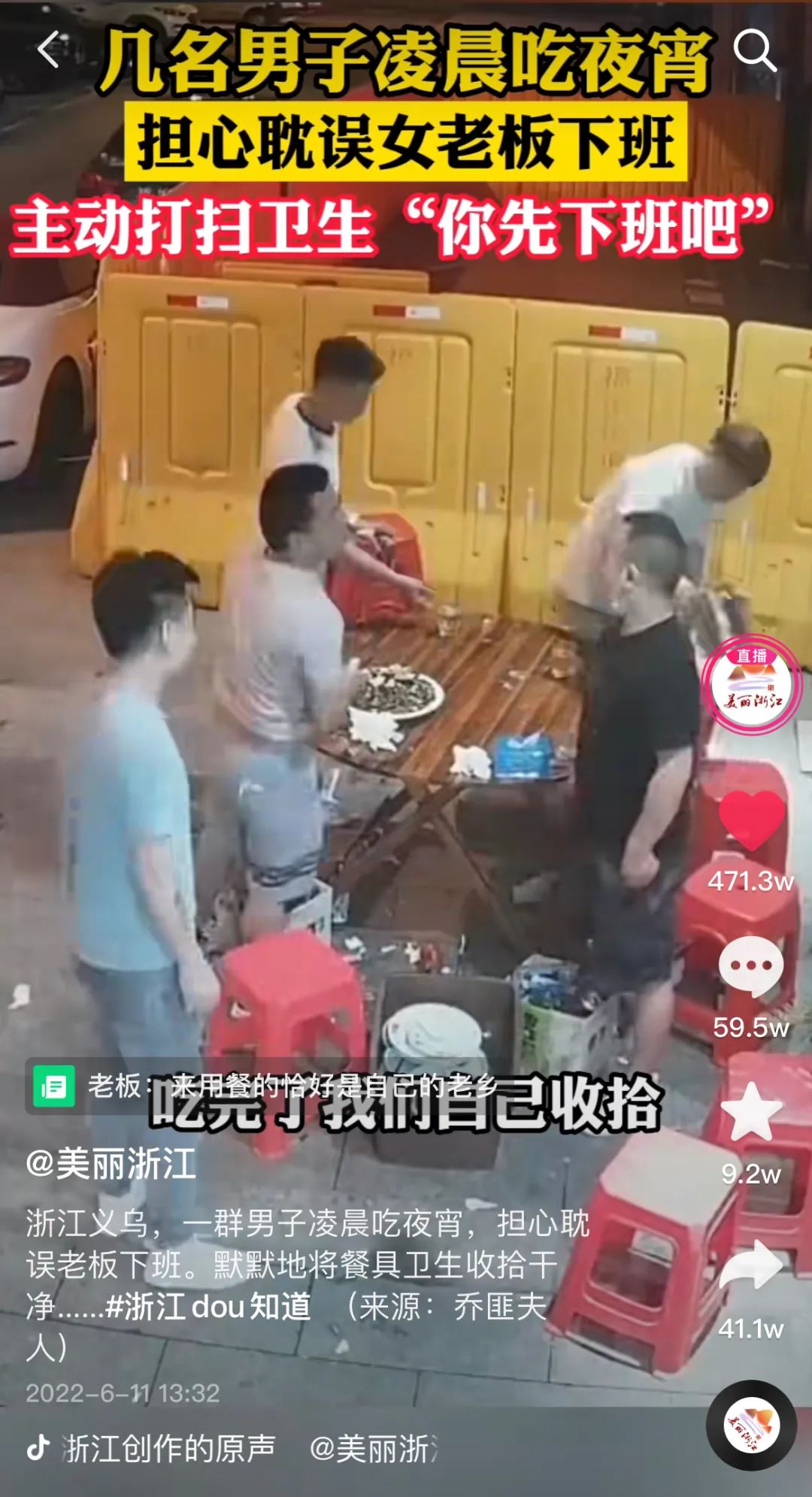 前不久,“美丽浙江”根据一个监控摄像头拍摄的画面制作了一条短视频,在浙江义乌,一群新浙江人吃完烧烤后,将烧烤摊打扫干净再离开,引发全网高度关注,一天内点赞数超过400万,登上抖音等平台热榜,并被人民网等央媒引用。