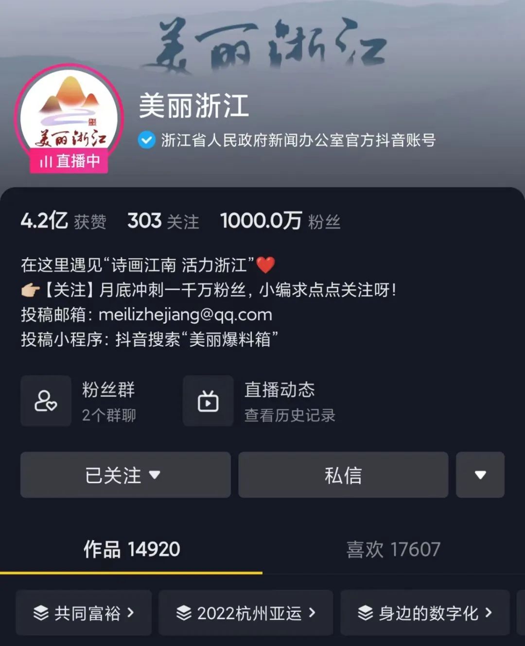 不久前,就在高考发榜的那几天,抖音平台发布了一份对“美丽浙江”的成绩单:粉丝数 1000万+ ;累计发布视频数 1.5万+;播放量 221亿+;累计获赞 4.2亿+。