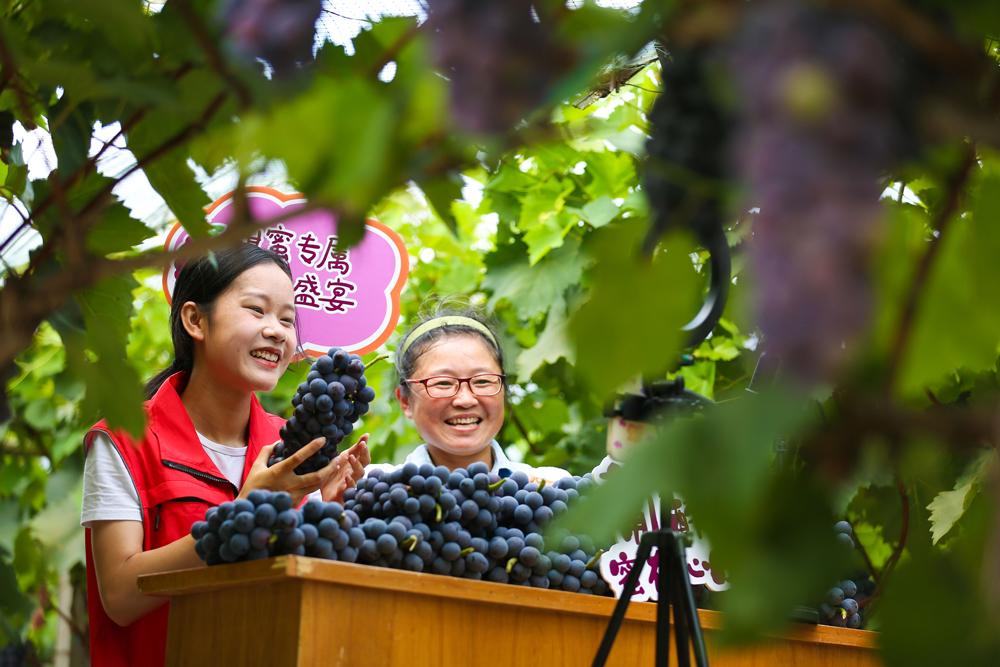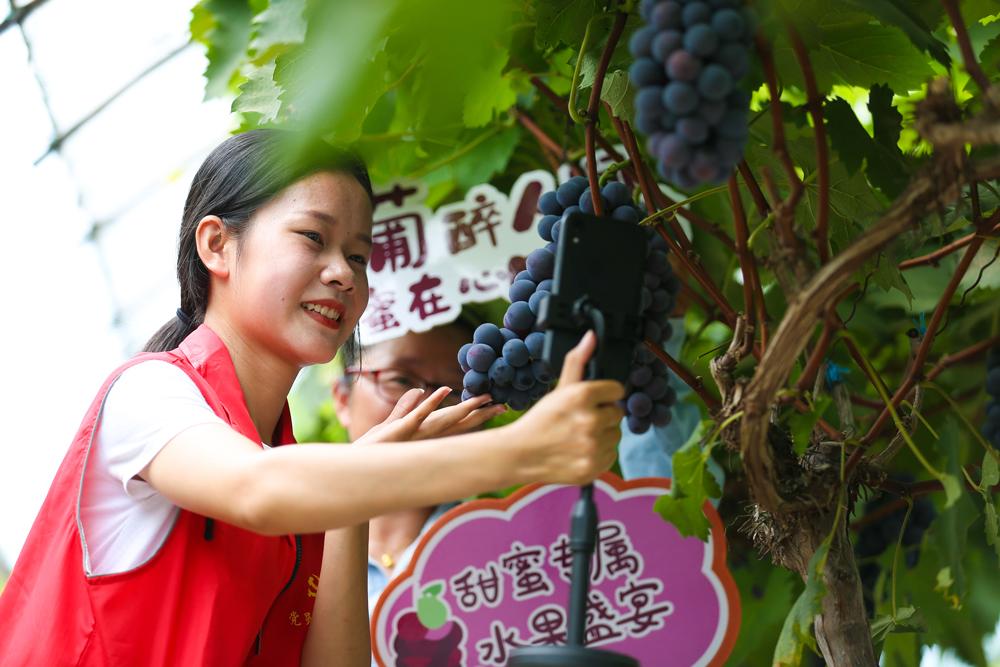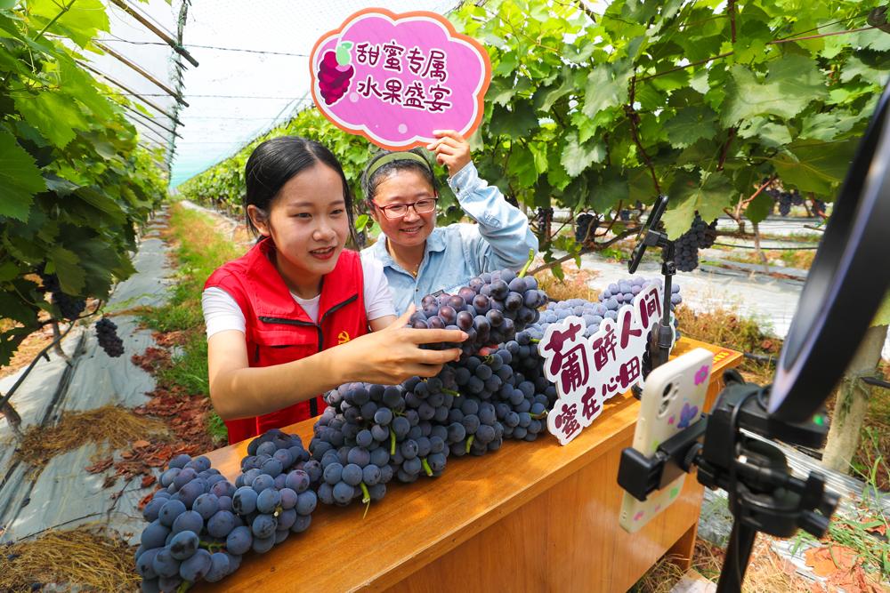 近日,在湖州市德清县钟管镇下塘村昊昊家庭农场,当地党员志愿者和果农在葡萄大棚内直播销售葡萄。